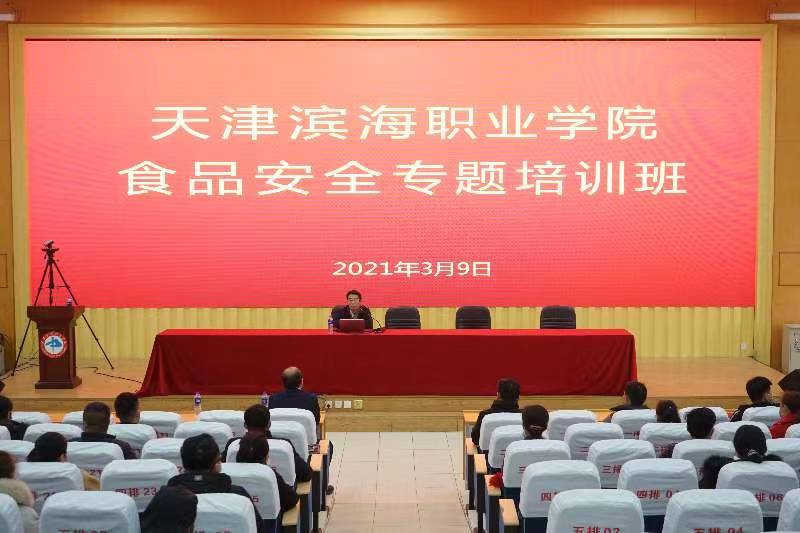 为全面贯彻落实天津市市场监管委、市教委《关于开展2021年春季学校食品安全专项监督检查工作的通知》(津市场监管食经〔2021〕2号)和市教委《关于印发(天津市教育系统食品安全检查工作指南2021版)的通知》(津教基建后勤函〔2021〕8号)精神,切实做好2021年春季学院食品安全保障工作,持续开展校园食品安全守护行动,3月9日我院在报告厅召开了2021年食品安全专项监督检查工作部署会议。党委副书记、院长杜学森,副院长刘一波,高新区市场监管局调研员张老师、社区蓝卡医院预防科副科长侯雪颖、学院保卫处、食堂管理办公室相关人员以及我院全体食品安全从业人员参加了此次专题培训会。