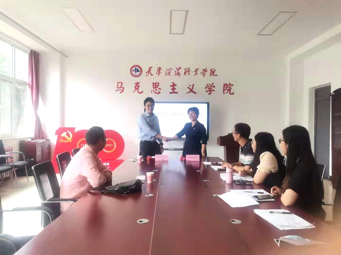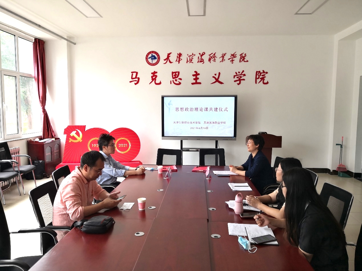 为深入学习贯彻习近平总书记关于教育的重要论述和全国教育大会、学校思想政治理论课教师座谈会精神,进一步落实《关于深化新时代学校思想政治理论课改革创新的若干意见》,提高思政课育人成效,2021年6月16日,我院马克思主义学院与天津生物工程职业技术学院思政部举行思想政治理论课结对共建签约仪式。天津生物工程职业技术学院思政部主任宋星滺、教研室主任李敬,我院马克思主义学院书记、院长李玉梅、思想道德修养与法治教研室主任武奎、形势与政策教研室主任李彬、思政课教师张赫、侯小静参加签约仪式,本次活动由马克思主义学院李玉梅同志主持。