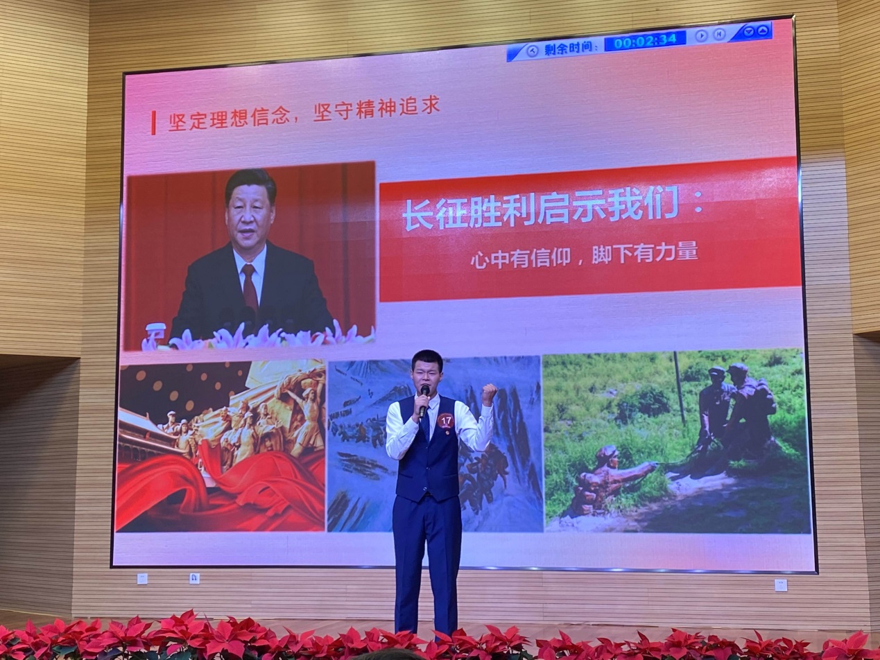 在总决赛中王文博同学用真诚的语言讲述了长征途中党和红军依靠坚定的理想信念和坚强的革命意志,一次次绝境重生,讴歌共产党员“革命理想高于天”的精神力量。同时结合我院机电工程系优秀毕业生张盼的事迹,展现了我院青年学子把个人理想融入国家和民族事业中的爱国情怀,充分抒发了青年学子对党和人民的热爱,展现了青年人的青春朝气和蓬勃生机。最终荣获大赛二等奖的佳绩。