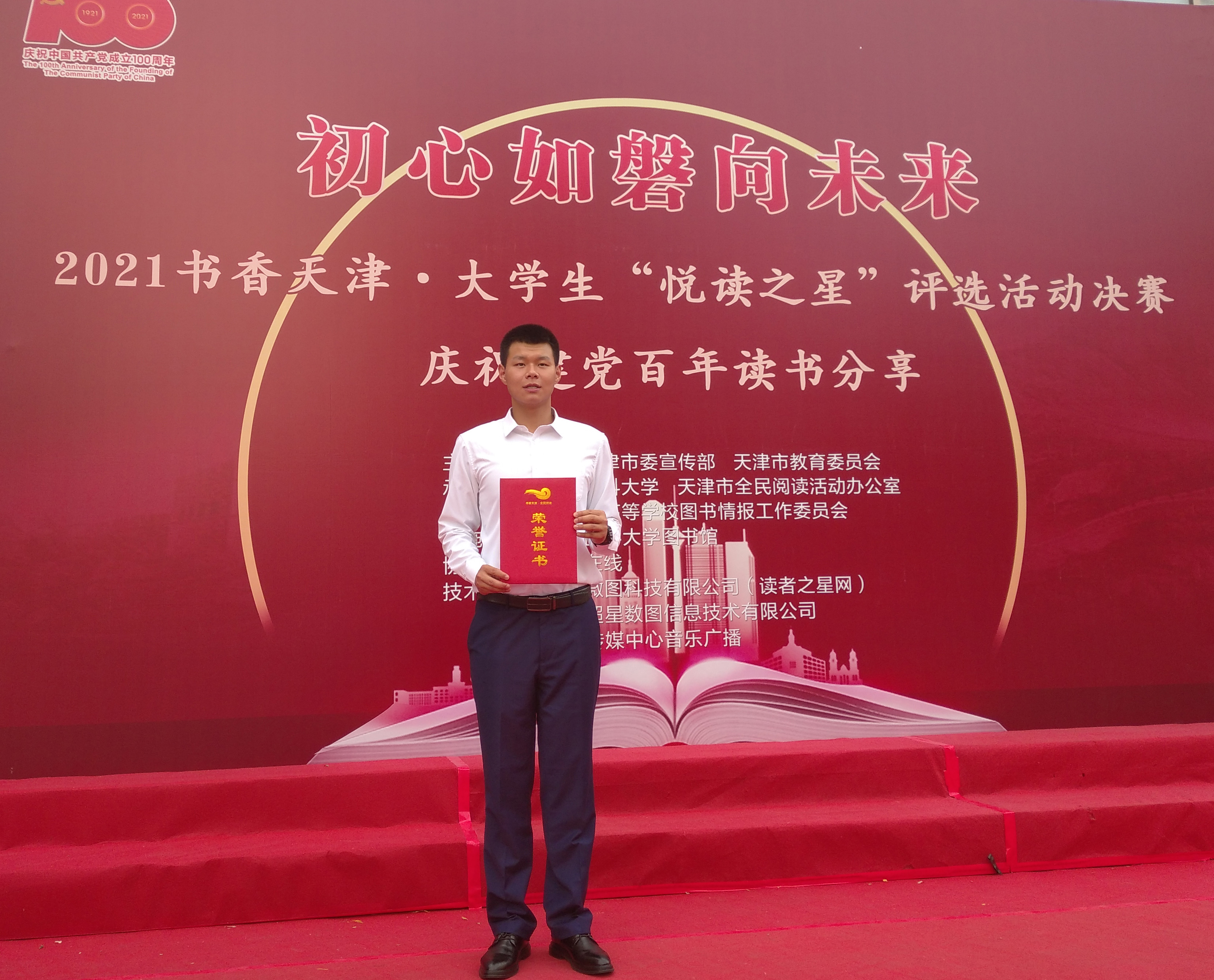 为引领当代大学生深入认识党的光辉历史,从历史中汲取新时代的智慧和力量,由市委宣传部、市教委联合主办的天津市2021年“初心如磐向未来”庆祝建党百年读书分享推荐活动暨2021书香天津·校园“悦读之星”总决赛于6月20日在天津医科大学举行。来自全市本科高校、军事院校、独立院校和高职高专53所学校的选手参赛,经过激烈的角逐,我院机电工程系王文博同学演讲的《坚定理想信念 走好新时代的长征路》荣获天津“悦读之星”二等奖的优异成绩。