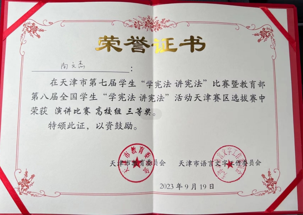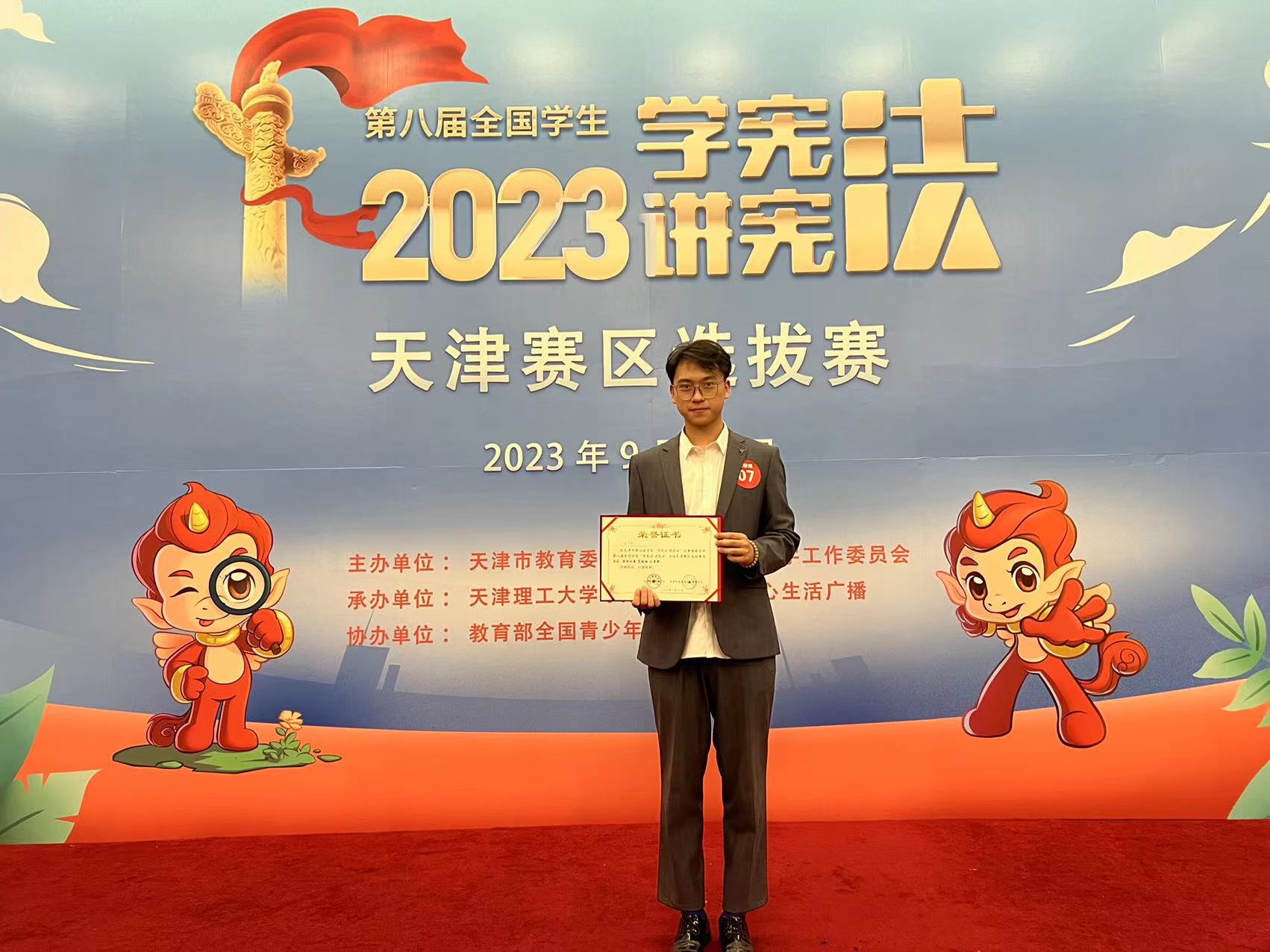 天津市第七届学生“学宪法 讲宪法”比赛暨教育部第八届全国学生“学宪法 讲宪法”活动天津赛区选拔赛于2023年9月19日在天津理工大学开赛,本次比赛共分为小学组、初中组、高中(中职)组、高校组,经过初赛选拔、复赛和决赛,我校师生不忘初心、奋勇拼搏,由马克思主义学院李彬老师指导的尚文杰同学和武奎老师指导的王峥同学,分别获得天津市三等奖和优秀奖。